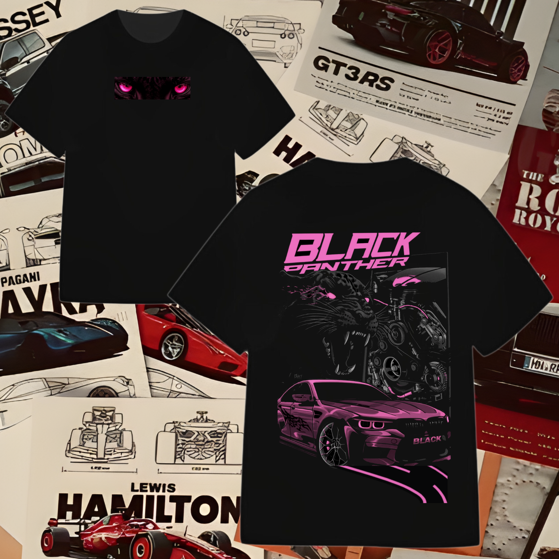 El gráfico trasero muestra un potente auto deportivo en color negro con detalles fucsia neón, acompañado del texto “Black Panther”, evocando fuerza, precisión y sofisticación. En el frente, un diseño minimalista complementa el look con equilibrio y elegancia.