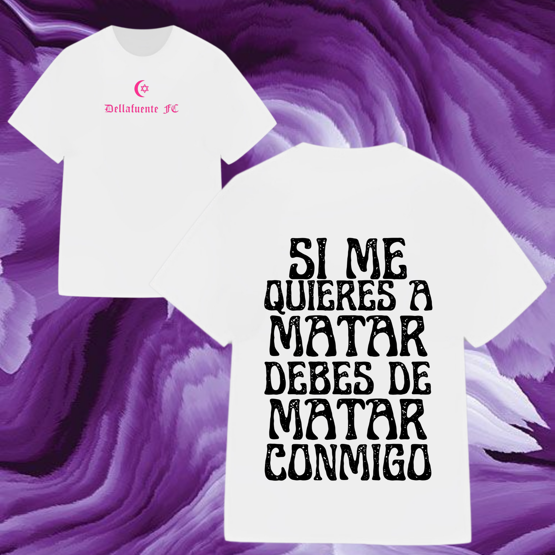 Felpa bianca con cappuccio Dellafuente con il disegno "Se vuoi uccidermi devi uccidermi" dalla canzone TUYYO