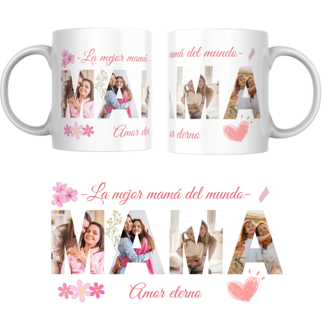 Este diseño especial incluye la palabra MAMÁ rellena con 4 fotos personalizadas que tú nos envías, acompañadas de frases emotivas como “La mejor mamá del mundo” y “Amor eterno”.